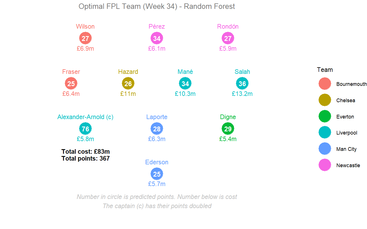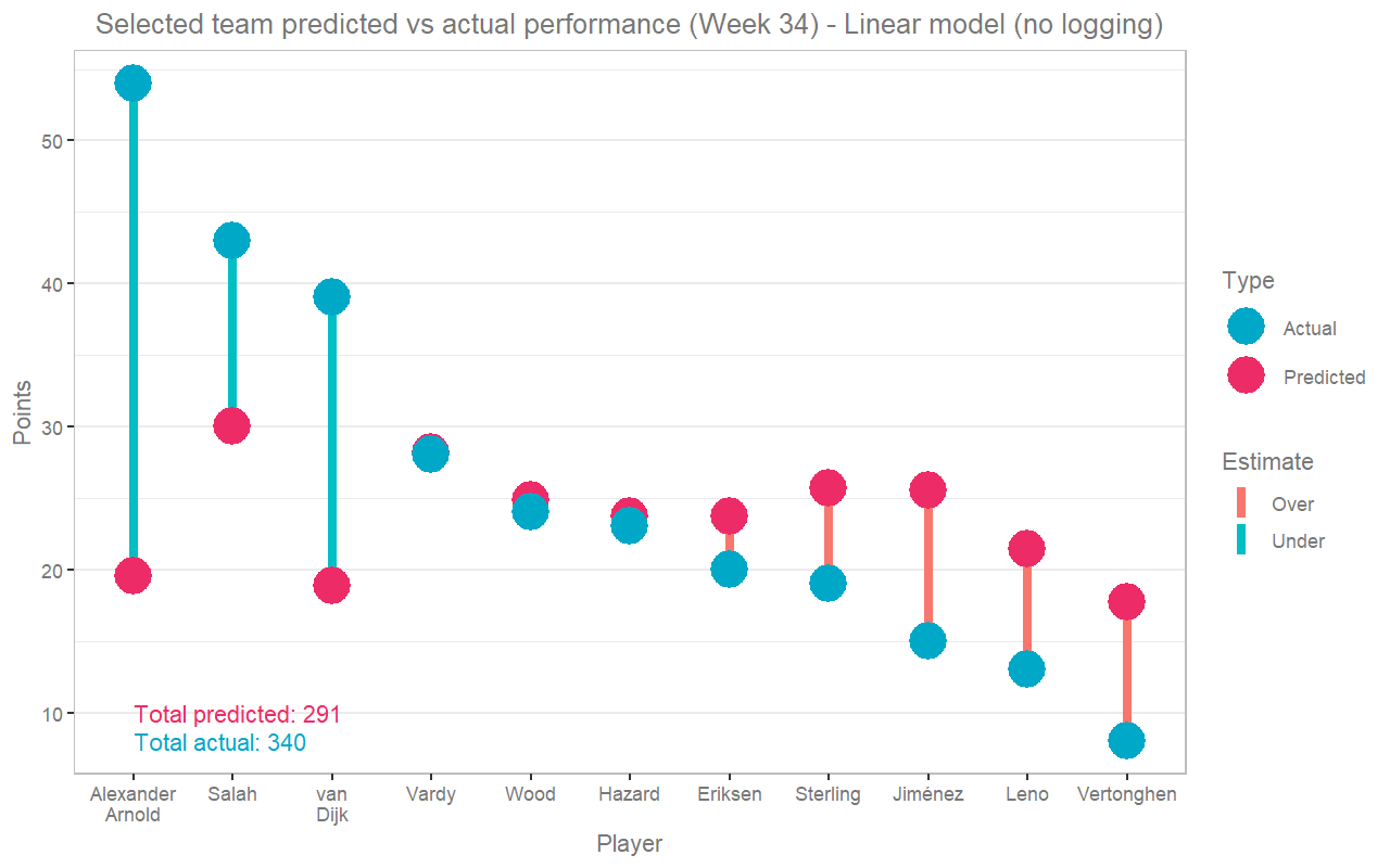 It predicted 291 points but that team would have actually scored 340 points - aided by the massive over-performance of two defenders (Alexander-Arnold and van Dijk) who it predicted would be the best to include but massively underestimated just how well they'd do (perhaps unsurprisingly as defenders typically don't score that many points).