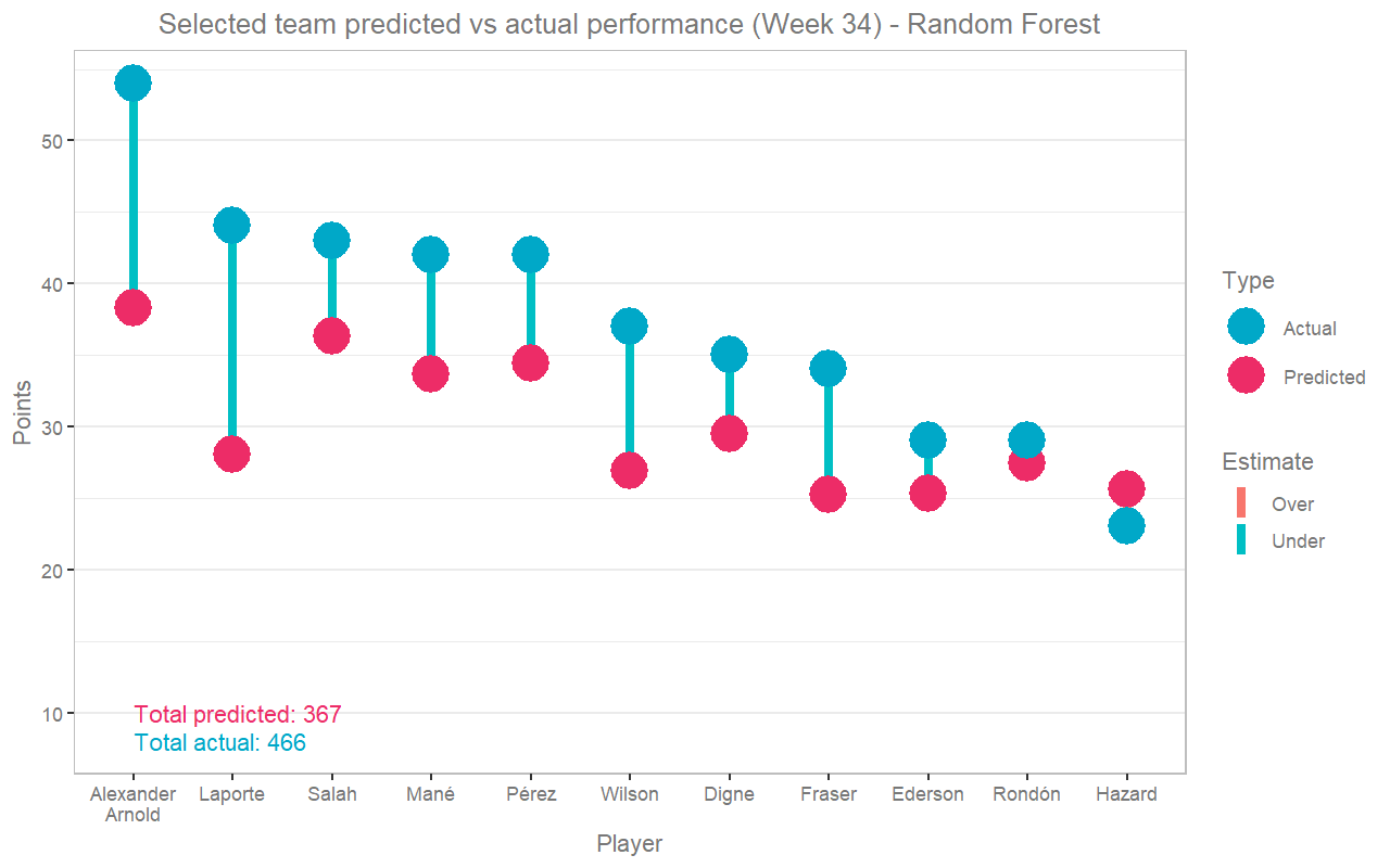 It also picked Alexander-Arnold - but was far closer in predicting his actual score. It predicted a total of 367 points for its team, but that team actually scored a massive 466 points. Overall we can see that the higher accuracy did, in this example, translate to more points.