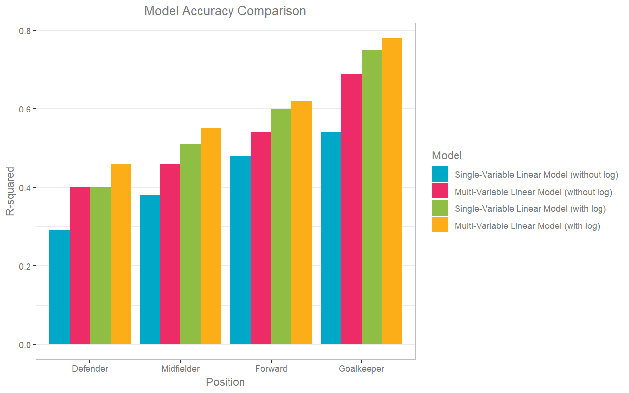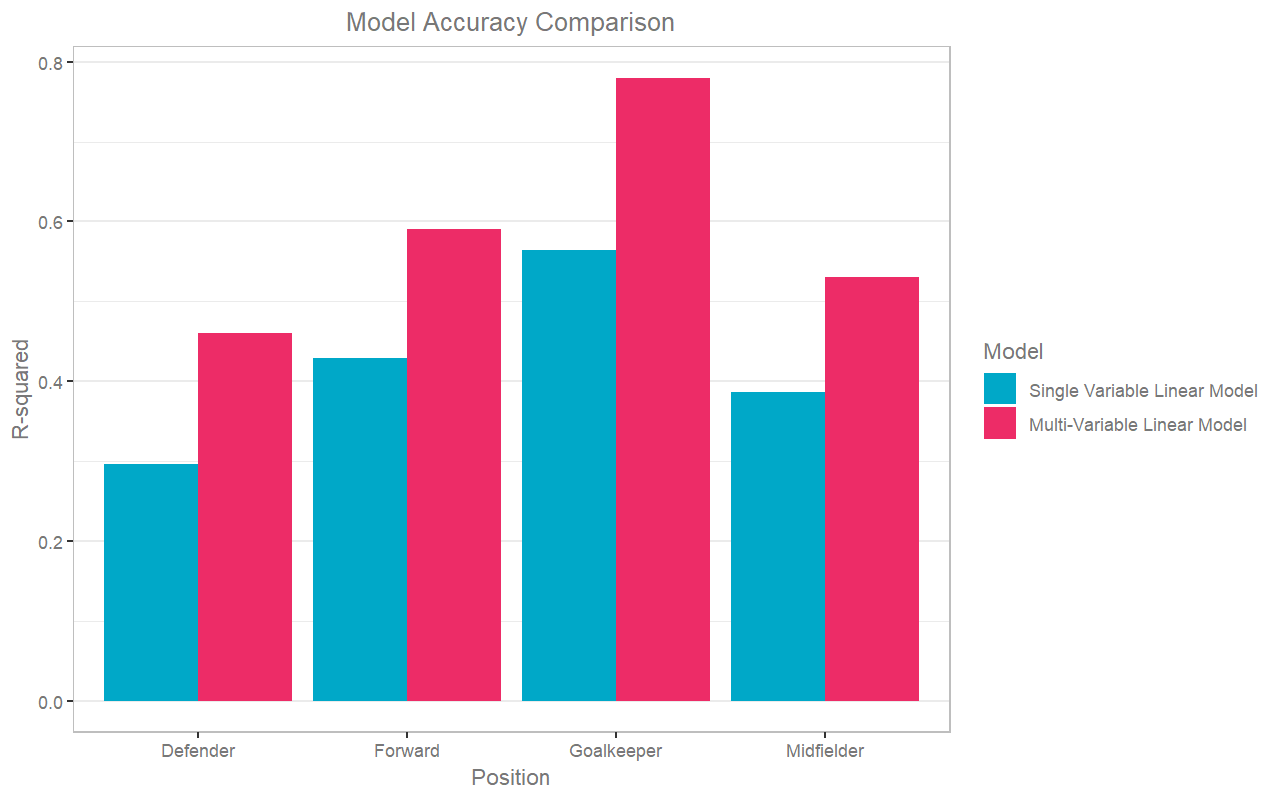 There's a clear positive relationship between the two, but the linear model itself here is not a very good predictor. The models have an R2 (a measure of much of the variance in the data is predicted by the model, where 100% is a perfect fit) varying from 30% to 56%, and show it seems to be easier to predict goalkeepers than defenders.