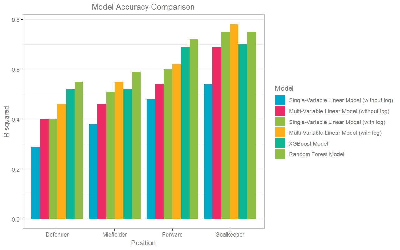 These machine learning algorithms generally performed better than their linear regression counterparts for all positions except goalkeeper. Recently xgboost has come to the forefront of modelling popularity - it dominates most competitions on Kaggle where a neural network wouldn't be appropriate. It's also more complex to tune than a random forest, and I imagine if I spent more time tuning it it could be the best here too.